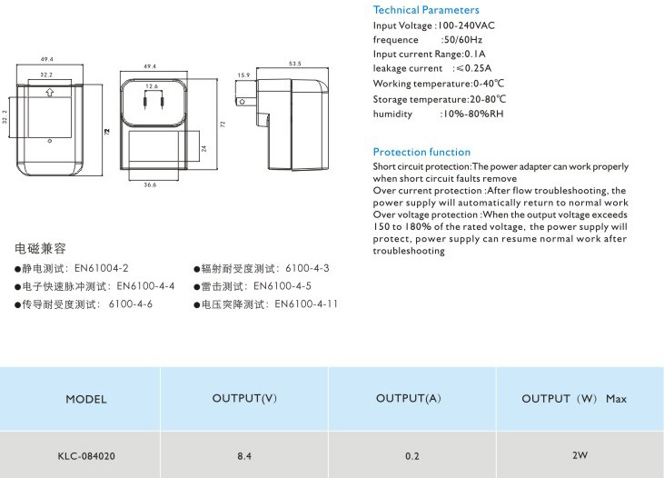 頻率:50/60Hz 輸入電流:0.1A 漏電電流:≤0.25A 工作溫度:0-40℃ 貯藏溫度:-20-80℃ 濕度:10%-80%RH 短路保護(hù): 電源適配器在短路解除時(shí)能正常工作恢復(fù) 過流保護(hù):過流故障排除后,電源將自動(dòng)恢復(fù)正常工作 過壓保護(hù):當(dāng)輸出電壓超過額定電壓的150-180%時(shí),電源將保護(hù),故障排除后電源能恢復(fù)正常工作" />